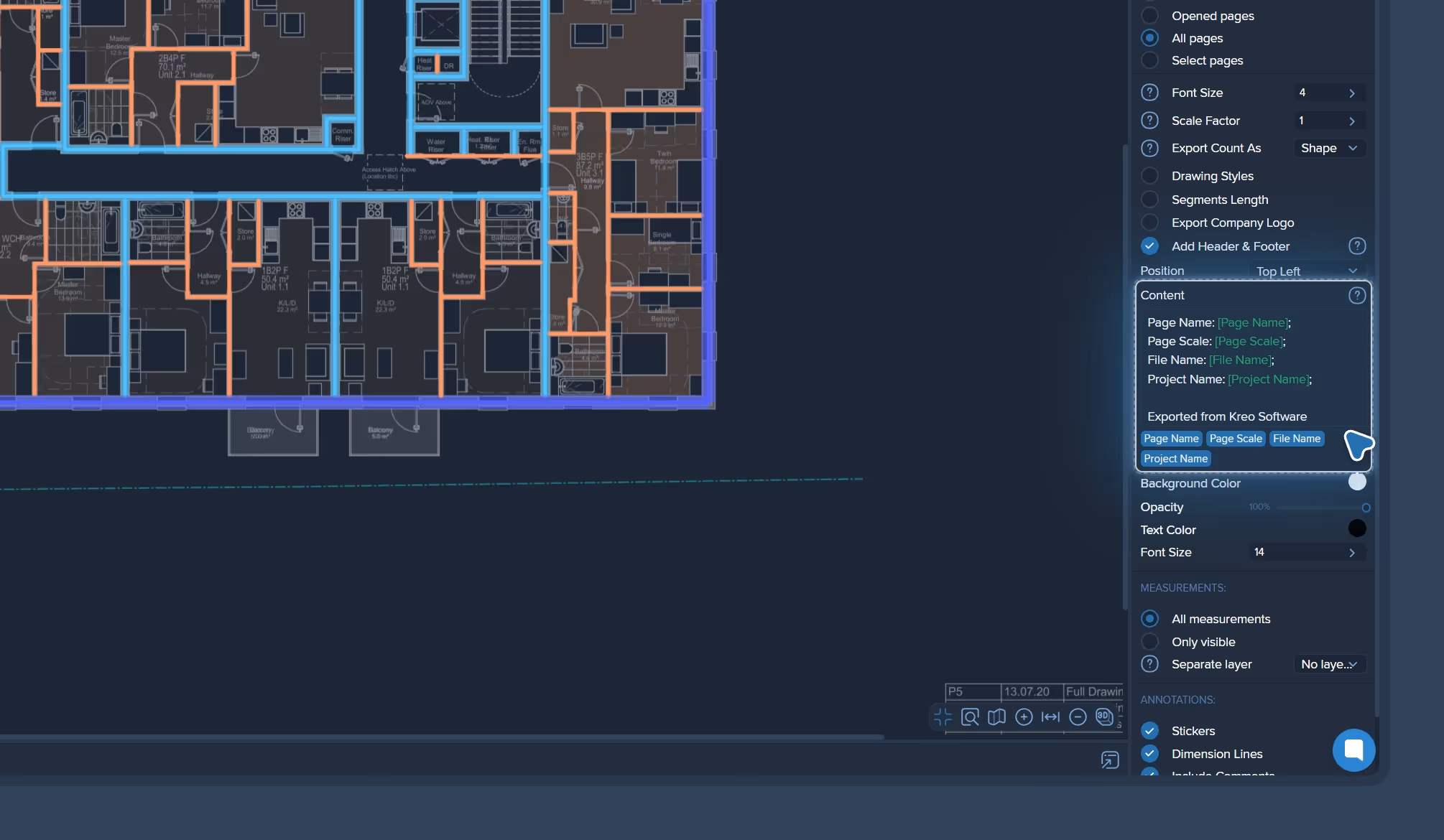 Styling settings apply to the entire project or selected sheets simultaneously. You don't need to configure each sheet individually - select the necessary pages in the export menu and click Export PDF. Kreo will automatically apply headers and footers to every file.